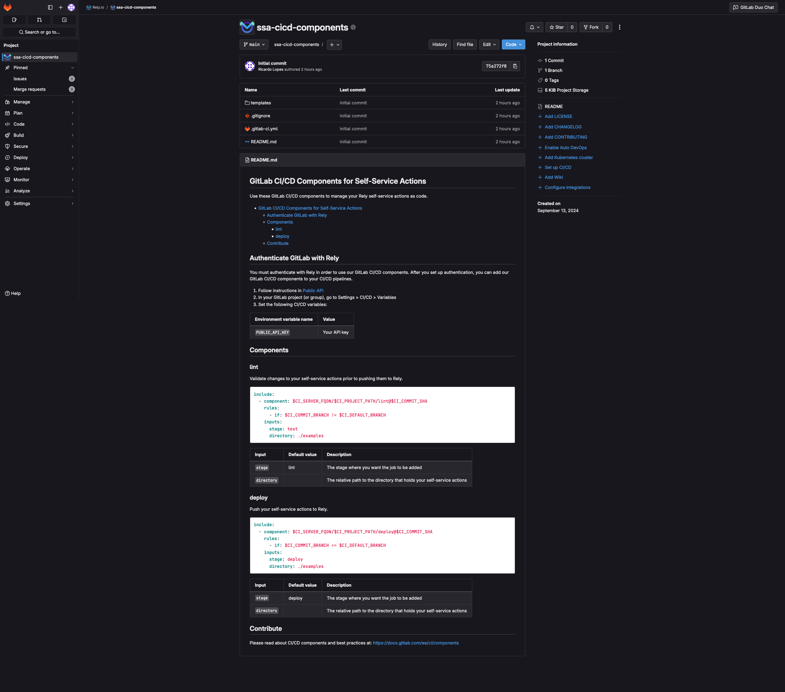 <figure><img src="https://1179008450-files.gitbook.io/~/files/v0/b/gitbook-x-prod.appspot.com/o/spaces%2F1eBCWu9rFSzq3ahnNrmL%2Fuploads%2FCqBqfepLjbYBGERs9Tu0%2FScreenshot%202024-09-18%20at%2017-20-40%20Rely.io%20_%20ssa-cicd-components%20%C2%B7%20GitLab.png?alt=media&#x26;token=0fef9c59-ca92-4165-b8a1-171805a4577f" alt=""><figcaption></figcaption></figure>